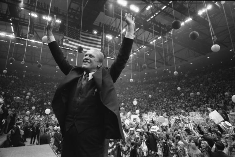 | Keywords: President Ford campaigns at the Nassau County Veterans Coliseum - NARA - 7027912.jpg  President Gerald Ford campaigning at the Nassau County Veterans Coliseum in Hempstead New York before returning to Michigan for the final days of the election campaign 7027912 Creator David Hume Kennerly Gerald R Ford Presidential Library http //www fordlibrarymuseum gov/avproj/campaign asp B2055-29A Institution Gerald R Ford Presidential Library 1976-10-31 Gerald R Ford Presidential Library and Museum-cooperation PD-USGov Uploaded with UploadWizard 1976 Campaign photo kit at the Gerald R Ford Presidential Library 1976 in New York Gerald Ford in 1976 Hand waving Men smiling while standing Gerald Ford presidential campaign 1976 Nassau Veterans Memorial Coliseum Photographs by David Hume Kennerly from 1976 |
