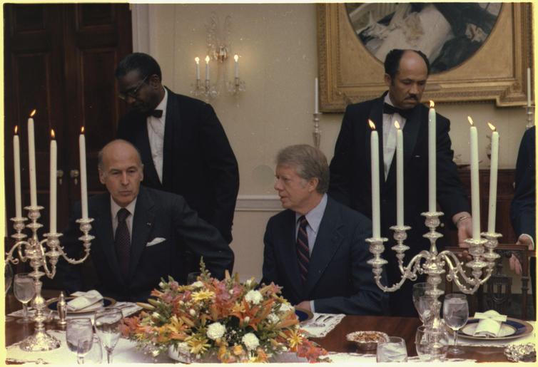 | Keywords: President Giscard d'Estaing of France and Jimmy Carter participate in a working dinner. - NARA - 179591.tif  Scope and content General notes 179591 Local identifier President 1977-1981 Carter White House Staff Photographers 01/20/1977 - 01/20/1981 Jimmy Carter Library NLJC 441 Freedom Parkway Atlanta GA 30307-1498 1978-05-26 Record group Collection JC-WHSP Carter White House Photographs Collection 01/20/1977 - 01/22/1981 Record group ARC 1120 Carter White House Photographs Presidential compiled 01/20/1977 - 01/22/1981 Series ARC 173341 File unit Working dinner for President G D'Estaing of France 05/26/1978 - 05/26/1978 File unit ARC 179590 Variant control numbers NAIL Control Number NLC-WHSP-C-05872-20 yes Other versions NARA-cooperation PD-USGov Jimmy Carter and Valéry Giscard d'Estaing |
