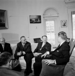 | Keywords: President John F. Kennedy Meets with Mohammad Ayub Khan, President of Pakistan.jpg en President John F Kennedy meets with President Mohammad Ayub Khan of Pakistan L “ R Secretary of State Dean Rusk; Vice President Lyndon B Johnson; President Mohammad Ayub Khan; President Kennedy head turned away from camera; sitting in fabric-covered rocking chair ; unidentified man back to camera Oval Office White House Washington D C 1961-07-11 http //www jfklibrary org/ Rowe Abbie 1905-1967 other versions PD-USGov Uploaded with UploadWizard John F Kennedy Muhammed Ayub Khan Presidents of Pakistan |