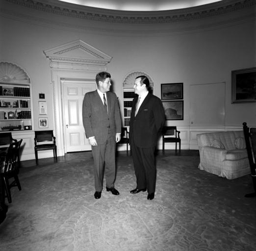 | Keywords: u.s. national archives usnationalarchives jfk presidential library jfkpresidentiallibrary blackandwhite monochrome indoor black and white Original Caption: President John F. Kennedy with Unidentified Visitor We are looking for your help in identifying unknown people in our White House Photographs collection. If you have any information about this photograph, please post a comment, including any relevant sources, for the catalogers at the John F. Kennedy Presidential Library. Thank you! Local Identifier: JFKWHP-ST-302-1-62 Created By: President (1961-1963 : Kennedy). Office of the Naval Aide to the President. (1961 - 1963) From: President (1963-1969 : Johnson). White House Photograph Office. (1963 - 1969) Contact: John F. Kennedy Library (LP-JFK), Columbia Point Boston, MA 02125-3398 Phone: 617-514-1600 Fax: 617-514-1652 Email: kennedy.library@nara.gov Production Dates: 7/3/1962 Scope and Content Note: In this photograph,President John F. Kennedy stands with an unidentified guest (right) in the Oval Office, White House, Washington, D.C. Persistent URL: JFK Library URL: www.jfklibrary.org/Asset-Viewer/Archives/JFKWHP-ST-302-1-... Access Restrictions: Unrestricted Use Restrictions: Unrestricted Original Caption: President John F. Kennedy with Unidentified Visitor We are looking for your help in identifying unknown people in our White House Photographs collection. If you have any information about this photograph, please post a comment, including any relevant sources, for the catalogers at the John F. Kennedy Presidential Library. Thank you! Local Identifier: JFKWHP-ST-302-1-62 Created By: President (1961-1963 : Kennedy). Office of the Naval Aide to the President. (1961 - 1963) From: President (1963-1969 : Johnson). White House Photograph Office. (1963 - 1969) Contact: John F. Kennedy Library (LP-JFK), Columbia Point Boston, MA 02125-3398 Phone: 617-514-1600 Fax: 617-514-1652 Email: kennedy.library@nara.gov Production Dates: 7/3/1962 Scope and Content Note: In this photograph,President John F. Kennedy stands with an unidentified guest (right) in the Oval Office, White House, Washington, D.C. Persistent URL: JFK Library URL: www.jfklibrary.org/Asset-Viewer/Archives/JFKWHP-ST-302-1-... Access Restrictions: Unrestricted Use Restrictions: Unrestricted |
