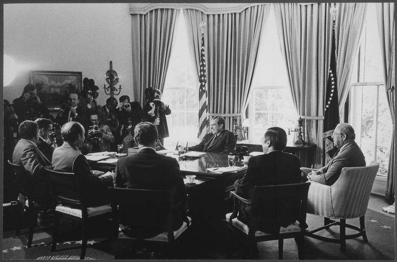 Keywords: President Nixon meeting with economic advisors and Cabinet members - NARA - 194579.tif Scope and content Pictured Clockwise from President Nixon George P Shultz James T Lynn Alexander M Haig Jr Roy L Ash Herbert Stein William E Simon Subject Press Conference General notes 194579 Local identifier NLRN-WHPO-E2729-07 General Services Administration National Archives and Records Service Office of Presidential Libraries Office of Presidential Papers 01/20/1969 - ca 12/1974 Most Recent <br /> President 1969-1974 Nixon White House Photo Office 1969 - 1974 Most Recent NARA-Author Schumacher Karl H Photographer 8451339 <br /> Richard Nixon Library NLRN 18001 Yorba Linda Boulevard Yorba Linda CA 92886 1974-05-07 Record group Collection RN-WHPO White House Photo Office Collection Nixon Administration 01/20/1969 - 08/09/1974 Record group ARC 1179 Nixon White House Photographs compiled 01/20/1969 - 08/09/1974 documenting the period 08/08/1968 - 08/09/1974 Series ARC 194277 File unit File unit ARC Variant control numbers NAIL Control Number NLNP-WHPO-MPF-E2729 07 yes Other versions NARA-cooperation PD-USGov May 1974 in the United States Richard Nixon in 1974 Richard Nixon with people George P Shultz James Thomas Lynn Alexander Haig |