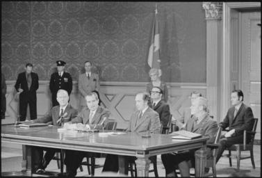 | Keywords: President Nixon and Prime Minister Trudeau at the signing ceremony for the Great Lakes Water Quality Agreement - NARA - 194763.tif Scope and content Pictured William P Rogers Richard M Nixon Pierre Trudeau Subject Heads of State - Canada General notes 194763 Local identifier NLRN-WHPO-8893-22 General Services Administration National Archives and Records Service Office of Presidential Libraries Office of Presidential Papers 01/20/1969 - ca 12/1974 Most Recent <br /> President 1969-1974 Nixon White House Photo Office 1969 - 1974 Most Recent NARA-Author Schumaker Byron E ca 1935- Photographer 8451340 <br /> Richard Nixon Library NLRN 18001 Yorba Linda Boulevard Yorba Linda CA 92886 1972-04-15 Record group Collection RN-WHPO White House Photo Office Collection Nixon Administration 01/20/1969 - 08/09/1974 Record group ARC 1179 Nixon White House Photographs compiled 01/20/1969 - 08/09/1974 documenting the period 08/08/1968 - 08/09/1974 Series ARC 194277 File unit File unit ARC Variant control numbers NAIL Control Number NLNP-WHPO-MPF-8893 22 yes Other versions NARA-cooperation PD-USGov Richard Nixon with national leaders |