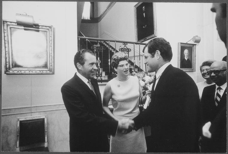 Keywords: President Nixon with League of Women Voters - NARA - 194624.tif Scope and content Pictured President Nixon Senator Ted Kennedy General notes 194624 Local identifier NLRN-WHPO-0813-26A General Services Administration National Archives and Records Service Office of Presidential Libraries Office of Presidential Papers 01/20/1969 - ca 12/1974 Most Recent <br /> President 1969-1974 Nixon White House Photo Office 1969 - 1974 Most Recent NARA-Author Atkins Oliver F 1916-1977 Photographer 8451334 <br /> Richard Nixon Library NLRN 18001 Yorba Linda Boulevard Yorba Linda CA 92886 1969-04-17 Record group Collection RN-WHPO White House Photo Office Collection Nixon Administration 01/20/1969 - 08/09/1974 Record group ARC 1179 Nixon White House Photographs compiled 01/20/1969 - 08/09/1974 documenting the period 08/08/1968 - 08/09/1974 Series ARC 194277 File unit File unit ARC Variant control numbers NAIL Control Number NLNP-WHPO-MPF-0813 26A yes Other versions NARA-cooperation PD-USGov Photographs by Ollie Atkins Richard Nixon shaking hands Ted Kennedy League of Women Voters |