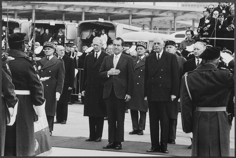 Keywords: President Nixon's arrival in France - NARA - 194609.tif Scope and content Pictured Richard M Nixon Charles DeGaulle Subject Heads of State - France General notes 194609 Local identifier NLRN-WHPO-0412-04A General Services Administration National Archives and Records Service Office of Presidential Libraries Office of Presidential Papers 01/20/1969 - ca 12/1974 Most Recent <br /> President 1969-1974 Nixon White House Photo Office 1969 - 1974 Most Recent NARA-Author Atkins Oliver F 1916-1977 Photographer 8451334 <br /> Richard Nixon Library NLRN 18001 Yorba Linda Boulevard Yorba Linda CA 92886 1969-03-01 Record group Collection RN-WHPO White House Photo Office Collection Nixon Administration 01/20/1969 - 08/09/1974 Record group ARC 1179 Nixon White House Photographs compiled 01/20/1969 - 08/09/1974 documenting the period 08/08/1968 - 08/09/1974 Series ARC 194277 File unit File unit ARC Variant control numbers NAIL Control Number NLNP-WHPO-MPF-0412 04A yes Other versions NARA-cooperation PD-USGov Photographs by Ollie Atkins |