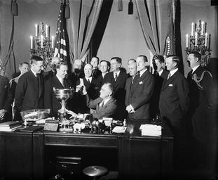 | Keywords: PRESIDENT PRESENTS REGATTA CUP.jpg en PRESIDENT PRESENTS REGATTA CUP GEORGE REIS WINNER OF THE RECENT PRESIDENT'S CUP REGATTA RECEIVES HIS TROPHY FROM THE CHIEF EXECUTIVE REIS IS THE ONLY MAN TO WIN THE CUP TWICE HE WAS ACCOMPANIED ON THIS TRIP TO THE WHITE HOUSE BY THE BOARD OF DIRECTORS OF THE PRESIDENT'S CUP REGATTA AND OTHER MOTORBOAT ENTHUSIASTS 1 negative glass 4 x 5 in or smaller Harris Ewing accession number LC-DIG-hec-47033 digital file from original negative Call Number LC-H21- C-326-B P P credit line Rights Advisory No known restrictions on publication hec 47033 Title from unverified caption data on negative or negative sleeve Date based on date of negatives in same range Gift; Harris Ewing Inc 1955 General information about the Harris Ewing Collection is available at http //hdl loc gov/loc pnp/pp hec other versions <gallery> president presents regatta cup tif tif </gallery> PD-Harris-Ewing Franklin Delano Roosevelt with people |