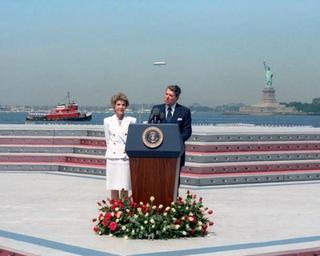 | Keywords: President Reagan giving speech on the Centennial of the Statue of Liberty 19860704.jpg President Reagan and Nancy Reagan speaking at Governors Island New York 1986-07-04 Ronald Reagan Presidential Library C35908-10 http //www reagan utexas edu/archives/photographs/reagans html author <gallery> File President Reagan giving speech on the Centennial of the Statue of Liberty Governor's Island New York 1986 jpg C35889-11 </gallery> cropped Vantey http //www reagan utexas edu/archives/photographs/large/C35908-10 jpg PD-USGov Files uploaded by Vantey Nancy and Ronald Reagan Remote views of the Statue of Liberty Tugboats in New York 4th of July Celebration 1986 1986 in New York City |