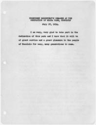 | Keywords: President Roosevelt's remarks at the dedication of Moana Park, Honolulu - NARA - 197463.jpg Scope and content General notes 197463 Local identifier President 1933-1945 Roosevelt 1933 - 1945 NARA-Author Roosevelt Franklin D Franklin Delano 1882-1945 Author 1301590 <br /> Honolulu Oahu Honolulu county Hawaii United States North and Central America inhabited place 4201560 21 3 -157 85 <br /> Franklin D Roosevelt Library NLFDR 4079 Albany Post Road Hyde Park NY 12538-1999 1934-07-27 Record group Collection FDR-PPF Papers as President President's Personal File 1933 - 1945 Record group ARC 1185 Speeches of President Franklin D Roosevelt compiled 1933 - 1945 Series ARC 197300 File unit First Carbon Files 1933 - 1945 File unit ARC 197301 Variant control numbers NAIL Control Number NLR-PPF-1820-1STCARBON-SA21 Other versions <gallery> File President_Roosevelt's_remarks_at_the_dedication_of_Moana_Park _Honolulu_-_NARA_-_197463 tif tif File President_Roosevelt's_remarks_at_the_dedication_of_Moana_Park _Honolulu_-_NARA_-_197463 jpg jpg </gallery> NARA-cooperation PD-USGov Documents related to Franklin Delano Roosevelt |