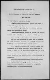 | Keywords: u.s. national archives usnationalarchives martin luther king, jr. martinlutherkingjr nara:arcid=299993 today's document todaysdocument january january 14 january14 holiday mourning martin luther king jr. day martinlutherkingjrday johnson president lyndon b. johnson presidentlyndonbjohnson proclamation presidential proclamation presidentialproclamation national day of mourning nationaldayofmourning 1968 presidential proclamation 3839 presidentialproclamation3839 president johnson presidentjohnson lbj april 5, 1968 april51968 april 7, 1968 april71968 assasination civil rights civilrights 04/05/1968 04051968 04/07/1968 04071968 lyndon johnson lyndonjohnson lyndon b. johnson lyndonbjohnson blackandwhite monochrome text document black and white Original Caption: Presidential Proclamation 3839 of April 5, 1968, by President Lyndon B. Johnson designating Sunday, April 7, 1968, as a day of national mourning for Martin Luther King, Jr., 04/05/1968 U.S. National Archives’ Local Identifier: NWCTB-11-PRDOCPI159E23-PP3839 From:Presidential Proclamations, compiled 1791 - 2007 Created By:National Archives and Records Administration. Office of the Federal Register. (04/01/1985 - ) Production Date: 4/5/1968 catalog.archives.gov/id/299993 Repository: Archives I (Washington DC) Reference Section, Textual Archives Services Division (NWCT1R) For information about ordering reproductions of photographs held by the Still Picture Unit, visit: www.archives.gov/research/order/still-pictures.html Reproductions may be ordered via an independent vendor. NARA maintains a list of vendors at www.archives.gov/research/order/vendors-photos-maps-dc.html Access Restrictions: Unrestricted Use Restrictions: Unrestricted Original Caption: Presidential Proclamation 3839 of April 5, 1968, by President Lyndon B. Johnson designating Sunday, April 7, 1968, as a day of national mourning for Martin Luther King, Jr., 04/05/1968 U.S. National Archives’ Local Identifier: NWCTB-11-PRDOCPI159E23-PP3839 From:Presidential Proclamations, compiled 1791 - 2007 Created By:National Archives and Records Administration. Office of the Federal Register. (04/01/1985 - ) Production Date: 4/5/1968 catalog.archives.gov/id/299993 Repository: Archives I (Washington DC) Reference Section, Textual Archives Services Division (NWCT1R) For information about ordering reproductions of photographs held by the Still Picture Unit, visit: www.archives.gov/research/order/still-pictures.html Reproductions may be ordered via an independent vendor. NARA maintains a list of vendors at www.archives.gov/research/order/vendors-photos-maps-dc.html Access Restrictions: Unrestricted Use Restrictions: Unrestricted |