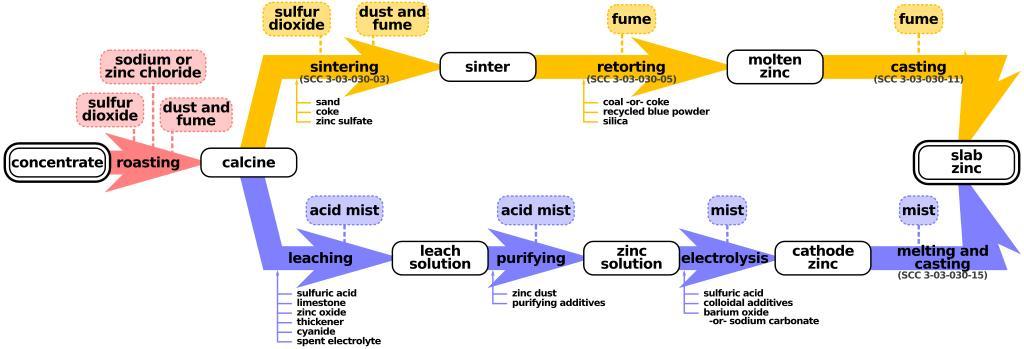Keywords: Primary zinc smelting flowchart -vector.svg US EPA document The top path is the pyrometallurgical process of smelting zinc and the bottom path is the electrolytic process Source Classification Codes are given in parentheses 2015-07-08 raster http //www epa gov/ttn/chief/ap42/ch12/final/c12s07 pdf US Environmental Protection Agency figure 12 7-1 <br /> vector own raster US Environmental Protection Agency <br /> vector Mliu92 other versions derived from 200 Zinc smelting flowchart png Translation possible PD-USGov Uploaded with UploadWizard Zinc smelting |