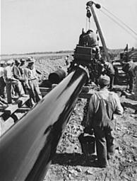 | Keywords: Priming Big Inch pipe with hot asphalt paint.jpg en Priming Big Inch pipe with hot asphalt paint No known restrictions For information see U S Farm Security Administration/Office of War Information Black White Photographs http //www loc gov/rr/print/res/071_fsab html 1943 http //www loc gov/pictures/resource/fsa 8d09035/ Vachon John 1914-1975 PD-USGov Uploaded with UploadWizard Oil pipeline companies of the United States | ||||