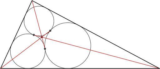 Keywords: Primo punto di Malfatti.svg il punto di intersezione dei segmenti che collegano i vertici dei triangolo ai punti opposti di tangenza fra i it cerchi di Malfatti Own 2008-02-22 Personline Malfatti circles