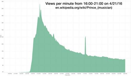 | Keywords: Prince article minute by minute en.wikipedia page views.jpg en Views per minute from 16 00-21 00 on 4/21/16 for https //en wikipedia org/wiki/Prince_ musician graph made using Tableau <br /><small>Data source <code> SELECT SUBSTRING dt 12 5 AS hourmin COUNT AS views FROM wmf webrequest WHERE year 2016 AND month 4 AND day 21 AND hour > 14 AND is_pageview AND agent_type 'user' AND pageview_info'page_title' 'Prince_ musician ' AND pageview_info'project' 'en wikipedia' GROUP BY SUBSTRING dt 12 5 ORDER BY hourmin LIMIT 10000<code></small> 2016-04-22 own ASherman WMF other versions cc-zero Wikipedia article traffic statistics |