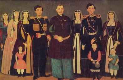 | Keywords: Prince Mukhranbatoni. 1862.jpg Mukhran-batoni á ááá áá á áááá¨áá áᥠáŤá ááŁáŽá áá ááá˘á á á with his family Oil on canvas 89X129 cm Art Museum of Georgia Tbilisi compiled and introduced by Tamaz Sanikidze 1985 Aurora Art Publishers Leningrad Author 1862 PD-Art Art of Georgia Nobility of Georgia Georgian paintings in Art Museum of Georgia Chokha in art House of Mukhrani Oil paintings Bagrationi dynasty in art 1862 paintings 1862 in Georgia People of Georgia with chokha 19th-century family portraits Caucasus costumes in portrait paintings |