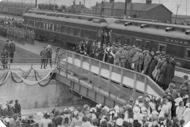 | Keywords: royal visit royalvisit king edward viii kingedwardviii prince of wales princeofwales mayor harry murphy harrymurphy fort william fortwilliam trains crowd ceremony cpr canadian pacific railway canadianpacificrailway military veterans photographer children speech ontario canada history blackandwhite monochrome outdoor black and white Date: September 1919 Description: It was a big day in early September 1919 when Edward, the Prince of Wales and the future King Edward VIII, visited the Lakehead. His mere appearance was enough to set crowds buzzing wherever he went and at one point onlookers broke through a police barricade to swarm the prince. Here he makes a presentation to Fort William mayor Harry Murphy. Accession No.: 977.113.130 Date: September 1919 Description: It was a big day in early September 1919 when Edward, the Prince of Wales and the future King Edward VIII, visited the Lakehead. His mere appearance was enough to set crowds buzzing wherever he went and at one point onlookers broke through a police barricade to swarm the prince. Here he makes a presentation to Fort William mayor Harry Murphy. Accession No.: 977.113.130 |