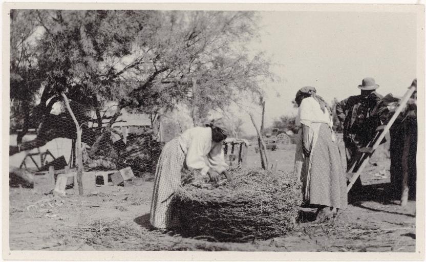 Keywords: smithsonian institution smithsonianinstitution national museum of the american indian nationalmuseumoftheamericanindian Photographer: Edward H. Davis (Edward Harvey Davis/E. H. Davis), Non-Indian, 1862-1951 Subject: Alena Levi (Helena Levi/Mrs. Louis Levy), Desert Cahuilla [Torres-Martinez Reservation/Torres-Martinez Band], ca. 1853-ca. 1922 Date Created: October 30, 1917 Catalog Number: P02323 Format: Silver gelatin print Dimensions: 3.25 x 5 in. Collection History: Edward H. Davis owned a ranch outside San Diego, California, and became fascinated with local Indian people. The collection of Native objects he developed attracted the attention of George Heye, who purchased many items from Davis and hired him as a field collector in 1916. Photographs by Davis from southern California and northern Mexico probably accompanied the objects he sold to or collected for MAI. Description: In a yard, Alena Levi (Levy), on left, adds arrow weed to the bottom of a large grainary basket (072271.000). Another woman and a man look on. According to Edward H. Davis, the basket did not have a bottom, but he asked Levi to add one before he bought the item from her. Place: Tova (Agua Dulce), Torres Martinez Reservation; Riverside County; California; USA Culture/People: Desert Cahuilla [Torres-Martinez Reservation/Torres-Martinez Band] Culture Hierarchy: Desert Cahuilla>Desert Cahuilla [Torres-Martinez Reservation/Torres-Martinez Band] Persistent URL:http://www.americanindian.si.edu/searchcollections/item.aspx?irn=323165 Repository:National Museum of the American Indian View more collections from the Smithsonian Institution. Photographer: Edward H. Davis (Edward Harvey Davis/E. H. Davis), Non-Indian, 1862-1951 Subject: Alena Levi (Helena Levi/Mrs. Louis Levy), Desert Cahuilla [Torres-Martinez Reservation/Torres-Martinez Band], ca. 1853-ca. 1922 Date Created: October 30, 1917 Catalog Number: P02323 Format: Silver gelatin print Dimensions: 3.25 x 5 in. Collection History: Edward H. Davis owned a ranch outside San Diego, California, and became fascinated with local Indian people. The collection of Native objects he developed attracted the attention of George Heye, who purchased many items from Davis and hired him as a field collector in 1916. Photographs by Davis from southern California and northern Mexico probably accompanied the objects he sold to or collected for MAI. Description: In a yard, Alena Levi (Levy), on left, adds arrow weed to the bottom of a large grainary basket (072271.000). Another woman and a man look on. According to Edward H. Davis, the basket did not have a bottom, but he asked Levi to add one before he bought the item from her. Place: Tova (Agua Dulce), Torres Martinez Reservation; Riverside County; California; USA Culture/People: Desert Cahuilla [Torres-Martinez Reservation/Torres-Martinez Band] Culture Hierarchy: Desert Cahuilla>Desert Cahuilla [Torres-Martinez Reservation/Torres-Martinez Band] Persistent URL:http://www.americanindian.si.edu/searchcollections/item.aspx?irn=323165 Repository:National Museum of the American Indian View more collections from the Smithsonian Institution. |