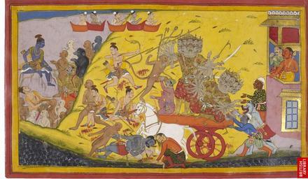 | Keywords: Print Ramayana - Pages 49 and 50.jpg en Ravana has sent out his mightiest warriors to fight the monkey leaders in single combat but each in turn has been destroyed He himself took the field fighting many of the greatest warriors in turn until he was faced by Laksmana Pierced in his breast by Ravana's spear Laksmana falls unconscious to the ground Meanwhile Hanuman rushes to Ravana's chariot and strikes him with his fist Ravana reels from this great buffet and falls in a faint Hanuman picks up Laksmana and carries him tenderly off the battlefield to Rama at whose feet he lays him down date http //www bl uk/onlinegallery/ttp/ramayana/accessible/pages49and50 html author PD-Art Uploaded with UploadWizard Ramayana |