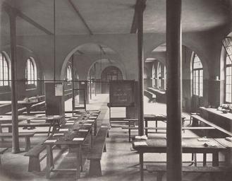 | Keywords: Prison de la Santé - Réfectoire et Salle d'École.jpg Photograph Creator Hippolyte-Auguste Collard en City Police Préfecture Paris en Prison de la Santé Réfectoire et Salle d'École - Large room with rows of wooden tables and bench seats papers and books on tables abacus and blackboard behind tables depicted people depicted place between 1876 1880 albumen silver 66 5 x 57 cm accession number H87 208/21 SLVIC-digitalimage 273521 H87 208/21 Album with leather covered cardboard covers 148 cardboard leaves holding 69 albumen silver print photographs on one side of leaf only Individual titles and official photographer stamped below image Title embossed on front cover with seal of the City of Paris in gilt ink ; title also on spine Label inside front cover reads Presented to the Public Library c Victoria on the eighth day of April 1881 by the Government of France Hand inscribed note on first page of album upper left Presented April 8th 1881 illegible Photographs various sizes 38 x 27 cm and smaller <br> Album was designed to show the use of photography in the solving of crimes and disasters Gift of the French Government possibly following the International Exhibition of 1880 <br> Official photographer's stamp on each page lower left some images dated 1876 and 1880 One photographer identified Hippolyte-Auguste Collard Institution State Library of Victoria object history exhibition history credit line Gift; Government of France; 1881 Information field Author Préfecture de police de Paris Service Photographique PD-100 Prison de la Santé Ville de Paris Préfecture de police Images of Paris from the State Library of Victoria Refectories |