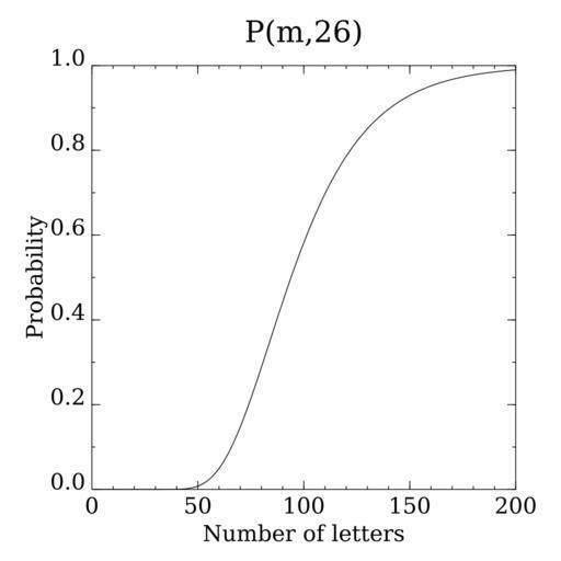 | Keywords: Probability that 0 ≤ m ≤ 200 random letters contain the entire alphabet.svg en A plot of <math>P m n \sum_ k 0 n -1 k n \choose k \left \frac n-k n \right m</math> for n 26 and 0 ‰¤ m ‰¤ 200 i e the probability than m uniformly distributed random letters will contain the entire 26-letter alphabet Own work by uploader computed with a Perl script given here plotted with GNU Plotutils tweaked in Inkscape Ilmari Karonen 2006-01-17 Other fields + 4 Combinatorics Functions | ||||