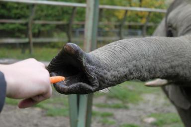 Keywords: proboscis elephant pachyderm zoo animal feed carrot eat take have