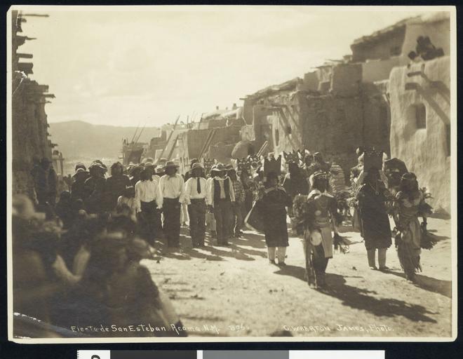 Keywords: Procession leaving the church during the Fiesta de San Esteban (Saint Stephen), Acoma Pueblo, ca.1886 (CHS-46722).jpg en <br> Procession leaving the church during the Fiesta de San Esteban Saint Stephen Acoma Pueblo ca 1886 Photograph of a procession leaving the church during the Fiesta de San Esteban Saint Stephen Acoma Pueblo ca 1886 The group of about 25 Acoma Indians step down the three steps before the entryway to the church The lower half of the outside of the church wall is stuccoed and white while the upper half is exposed adobe brick A small mound of dirt sits on the dirt road at the foot of the steps Call number CHS-46722 Photographer James George Wharton Provenance Southwest Native American Photograph Collection Filename CHS-46722 Coverage date circa 1886 Part of collection California Historical Society Collection 1860-1960 Type images Geographic subject city or populated place Acoma Pueblo Repository name USC Libraries Special Collections Accession number 46722 Archival file chs_Volume110/CHS-46722 tiff Part of subcollection Title Insurance and Trust and C C Pierce Photography Collection 1860-1960 Repository address Doheny Memorial Library Los Angeles CA 90089-0189 Geographic subject country USA Format aacr2 1 photograph photoprint b w ; 17 x 22 cm Rights Digitally reproduced by the USC Digital Library; From the California Historical Society Collection at the University of Southern California Subject adlf religious facilities Project USC Repository email specol usc edu Identifying number unidentified no James-894 Contributing entity California Historical Society Date created circa 1886 Publisher of the digital version University of Southern California Libraries Format aat photographic prints; photographs Geographic subject state New Mexico Legacy record ID chs-m21151; USC-1-1-1-13461 Access conditions Send requests to address or e-mail given Phone 213 821-2366; fax 213 740-2343 Subject file heading Indians -- Acoma Subject lcsh Indians of North America; Acoma Indians Subject Acoma Indians; Acoma circa 1886 date created George Wharton James 1858 1923 http //digitallibrary usc edu/cdm/ref/collection/p15799coll65/id/20146 PD-old-70-1923 Images from USC Digital Library uploaded by Fæ Photographs by George Wharton James California Historical Society Collection 1860-1960 Acoma Pueblo |
