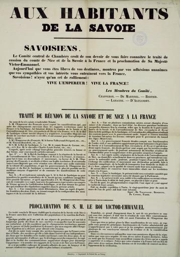 Keywords: Proclamation-VictorEmmanuel1860.jpg fr Aux habitants de la Savoie Traité de réunion de la Savoie et de Nice à la France Proclamation de S M le roi Victor-Emmanuel 24 mars 1860 «Cette affiche provient des archives départementales de la Savoie et du site Internet de Conseil général de la Savoie http //www savoie fr/archives73/expo_affiches_1814-1860/ Aux habitants de la Savoie annexion; Savoie; Chambéry Imprimeur de Puthod fils au Verney 1860 1860 PD-old PD-old Poster of Savoie |