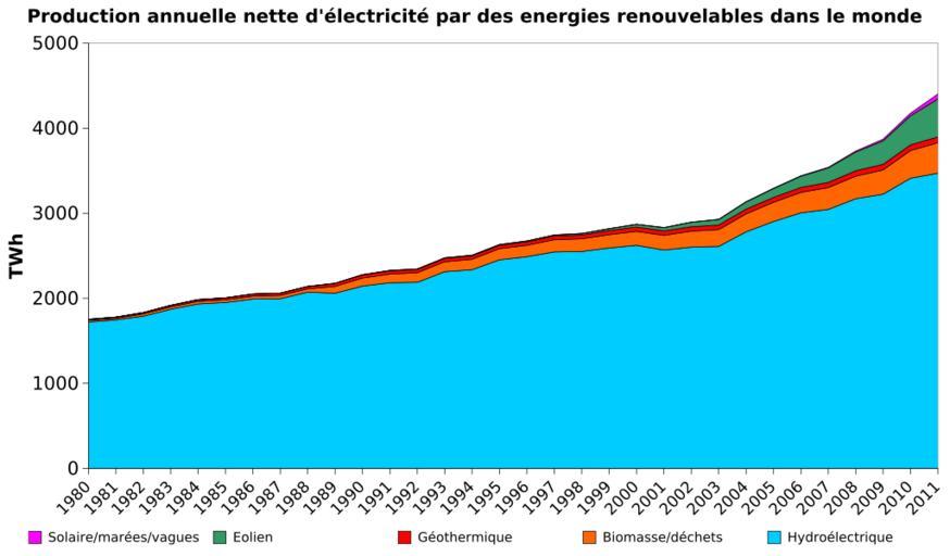 | Keywords: Production électricité énergies renouvelables dans le monde.svg fr production annuelle nette d'électricité par des énergies renouvelables dans le monde 1980-2011 Created with Gnumeric http //www eia gov/countries/data cfm EIA Lery007 2012-04-22 Cc-zero thumb English version Renewable energy statistics |