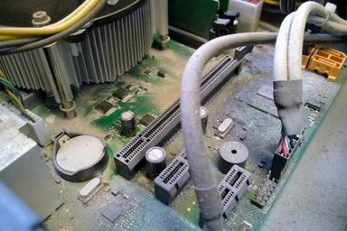 | Keywords: clay dust claydust dirty dusty fujitsu esprimo fujitsuesprimo motherboard project 365 project365 I got a call this morning to one of the art rooms, where the teacher reported that his computer was 'on the blink'. This room gets used a lot for clay work and has a reputation amongst the cleaners as the room you really, really don't want. The dust filled atmosphere just kills equipment, but even I was surprised when I opened this to find a motherboard looking the Sahara. I broke out a Henry and between us managed to resuscitate the beast, with Dave clearing the main motherboard power coupling doing the best and most effective work. Ew. I got a call this morning to one of the art rooms, where the teacher reported that his computer was 'on the blink'. This room gets used a lot for clay work and has a reputation amongst the cleaners as the room you really, really don't want. The dust filled atmosphere just kills equipment, but even I was surprised when I opened this to find a motherboard looking the Sahara. I broke out a Henry and between us managed to resuscitate the beast, with Dave clearing the main motherboard power coupling doing the best and most effective work. Ew. |