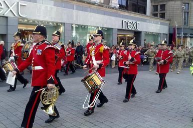 | Keywords: 208 field hospital 208fieldhospital marching band marchingband military parade militaryparade project 366 project366 returning soldiers returningsoldiers ta outdoor Interestingly enough this photo was taken in almost exactly the same location as last week's. And once again it's from the mobile phone as I was without my camera due to changing coats. We were in town shoe shopping, and noticed a couple of police motorbikes and a loud noise coming up Church Street. It turned out to be a march of the soldiers of the TA's 208 Field Hospital that has been out in Afghanistan. I don't know her face well enough to see if she was in the parade, but this is the unit that Laura's lab manager serves in, so I now feel my applause was well justified. On the bus home we saw that they marched up to St. George's Hall where they had a formal reception on the Plaza. Good job. Interestingly enough this photo was taken in almost exactly the same location as last week's. And once again it's from the mobile phone as I was without my camera due to changing coats. We were in town shoe shopping, and noticed a couple of police motorbikes and a loud noise coming up Church Street. It turned out to be a march of the soldiers of the TA's 208 Field Hospital that has been out in Afghanistan. I don't know her face well enough to see if she was in the parade, but this is the unit that Laura's lab manager serves in, so I now feel my applause was well justified. On the bus home we saw that they marched up to St. George's Hall where they had a formal reception on the Plaza. Good job. |
