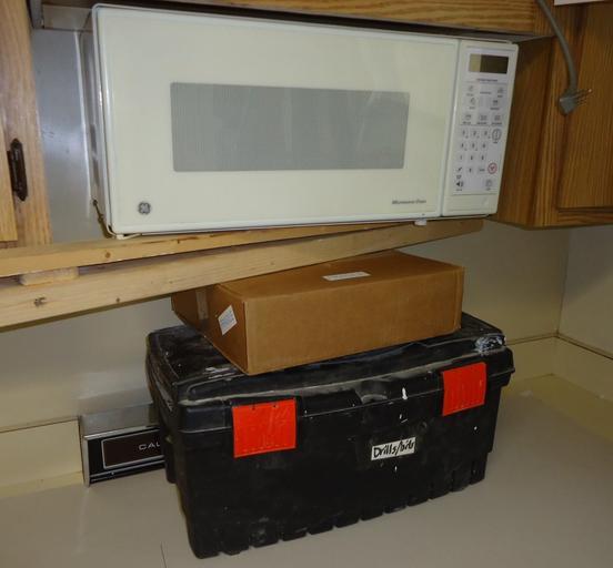 | Keywords: Project to move cabinet and microwave 4 inches higher.JPG en The white microwave oven was about to be removed but first it was supported beneath by a toolbox and a box so when the screws were removed it did not fall down 2014-05-07 own Tomwsulcer cc-zero Uploaded with UploadWizard Microwave ovens Tool boxes Handyman photos by tom sulcer |