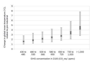 | Keywords: Projected global warming in 2100 for a range of emission scenarios.png pre-industrial times in the year 2100 for a range of scenarios Pre-industrial times are approximated as the years 1850 to 1900 7 sets of temperature projections are given for different atmospheric concentrations of greenhouse gases measured in parts per million of carbon dioxide equivalents in the year 2100 On the graph the dark grey area of the bar shows 10th to 90th percentile range of median estimates while the light grey area of the bar shows the 16th to 84th percentile range of the full distribution of results Graph data is tabulated in a later section References citation 2014 IPCC AR5 WG3 CITEREFIPCC AR5 WG3 Edenhofer O et al Climate Change 2014 Mitigation of Climate Change Contribution of Working Group III WG3 to the Fifth Assessment Report AR5 of the Intergovernmental Panel on Climate Change IPCC http //mitigation2014 org/report/final-draft/ Cambridge University Press harv Archived https //web archive org/web/20140629152007/http //mitigation2014 org/report/final-draft 29 June 2014 Data are taken from Table SPM 1 in http //report mitigation2014 org/spm/ipcc_wg3_ar5_summary-for-policymakers_approved pdf Summary for Policymakers p 13 archived https //web archive org/web/20140629044914/http //report mitigation2014 org/spm/ipcc_wg3_ar5_summary-for-policymakers_approved pdf 29 June 2014 Explanation of the projections is given in Figure 6 13 in http //report mitigation2014 org/drafts/final-draft-postplenary/ipcc_wg3_ar5_final-draft_postplenary_chapter6 pdf Chapter 6 Assessing Transformation Pathways p 34 archived https //web archive org/web/20140629152007/http //report mitigation2014 org/drafts/final-draft-postplenary/ipcc_wg3_ar5_final-draft_postplenary_chapter6 pdf 29 June 2014 2014-10-07 07 21 36 own Enescot other versions Data wikitable - GHG concentration Temperature - Full low Median low Median high Full high - 430 to 480 1 1 5 1 7 2 8 - 480 to 530 1 2 1 7 2 3 3 - 530 to 580 1 4 2 2 3 3 6 - 580 to 650 1 5 2 3 2 6 4 2 - 650 to 720 1 8 2 6 2 9 4 5 - 720 to 1000 2 1 3 1 3 7 5 8 - 1000 and greater 2 8 4 1 4 8 7 8 cc-zero Uploaded with UploadWizard Global warming graphs |