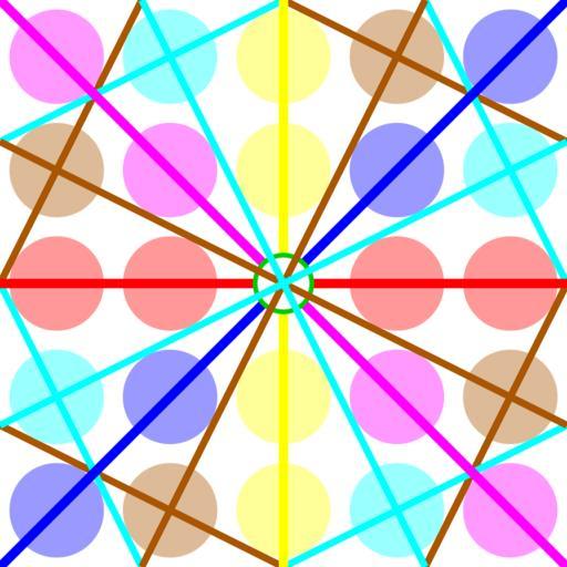 | Keywords: Projectivisation F5P^1.svg 6 color coordinates equation - <font color FFFF00> </font> 0 1 x 0 - <font color FF0000> </font> 1 0 y 0 - <font color 0000FF> </font> 1 1 y x - <font color FF00FF>\</font> 1 1 y x - <font color AA5500>×</font> 1 2 y 2x - <font color 00FFFF>×</font> 1 2 y 2x finite field F<sub>5</sub> ru П оективная п ямая F<sub>5</sub>P<sup>1</sup> над конечным полем F<sub>5</sub> fr La droite projective F<sub>5</sub>P<sup>1</sup> sur un corps fini F<sub>5</sub> Own Incnis Mrsi 2009-07-26 public domain see projective line over a finite field Example of using in design <nowiki> Projectivisation F5P 1 svg 150px </nowiki> - Projectivisation F5P 1 svg 150px Finite fields Geometric patterns |