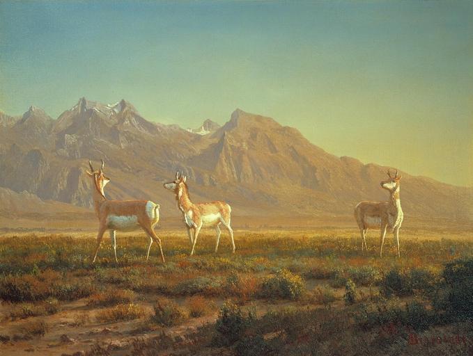 Keywords: Prong-Horned Antelope-Albert Bierstadt.jpg Artwork Creator Albert Bierstadt ca 1865 oil canvas cm 42 9 57 2 National Museum of Wildlife Art object history Gift of the Stonehollow Collection National Museum of Wildlife Art credit line accession number W2008 018 http //www wildlifeart org/ViewArtwork/index php tID 576 National Museum of Wildlife Art PD-old-100 Landscape paintings of the United States by Albert Bierstadt Antilocapra americana 1865 paintings in the United States National Museum of Wildlife Art 1860s landscape paintings |
