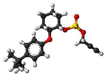 | Keywords: Propargite-3D-balls.png Ball-and-stick model of the propargite molecule a pesticide Colour code 505050 Carbon C black<br> F0F0F0 Hydrogen H white<br> F51E1E Oxygen O red<br> FAEB00 Sulfur S yellow<br> 2011-01-26 own DS Visualizer Jynto talk Space-filling version cc-zero Propargite Tert-butylbenzenes Phenol ethers Cyclohexane derivatives Ball-and-stick models Sulfite esters Alkyne derivatives Images by Jynto | ||||