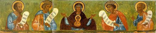 | Keywords: Prophets line (16th c., GTG).jpg П о оческий чин Россия Пе вая половина XVI века Де ево темпе а Разме - 26 5 х 126 см В цент е изоб ажена Богомате ь Воплощение По сто онам от её п о оки слева - Давид и оисей сп ава - Соломон и Иона http //www obraz org/index php menu iconography base 14 struct 314 icon_id 1314 Пе вая половина XVI века anonymous 16th-century icons in the Tretyakov Gallery Files uploaded by Shakko from various sources Prophets line in iconostasis 16th-century icons of Russia David in icons Icons of Moses Solomon in icons Jonah in icons PD-Art |