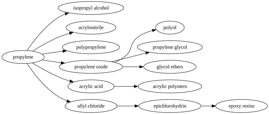 Keywords: Propylene chemical production network.svg Petrochemical Produced using Graphviz Source code is below <pre>digraph G rankdir LR propylene -> isopropyl alcohol propylene -> acrylonitrile propylene -> polypropylene propylene -> propylene oxide propylene oxide -> polyol propylene oxide -> propylene glycol propylene oxide -> glycol ethers propylene -> acrylic acid acrylic acid -> acrylic polymers propylene -> allyl chloride allyl chloride -> epichlorohydrin epichlorohydrin -> epoxy resins </pre> own Mr3641 2010-10-25 Chemical processes Propylene |