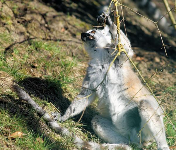 Keywords: prosimian ring tailed lemur lemur catta lemur striped madagascar mammal zoo sit ringed tail face foraging a