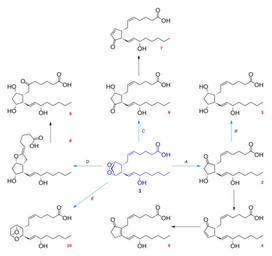| Keywords: Prostanoid synthesis numbered.svg Schematic diagram of w prostanoid synthesis from prostaglandin H<sub>2</sub> Created with http //www acdlabs com/download/chemsk html ACD/ChemSketch 10 0 and Inkscape Created with Inkscape ;Legend blue Parent compound w prostaglandin H<sub>2</sub> red Daughter compounds lightblue w Enzyme -mediated reaction Enzyme<br> Prostanoid compound ;Compounds depicted Prostaglandin H<sub>2</sub> Prostaglandin E<sub>2</sub> Prostaglandin F<sub>2</sub> Prostaglandin A<sub>2</sub> Prostaglandin B<sub>2</sub> Prostaglandin D<sub>2</sub> Prostaglandin J<sub>2</sub> Prostaglandin I<sub>2</sub> prostacyclin 6-keto-prostaglandin Fα Thromboxane A<sub>2</sub> ;Enzymes depicted A Prostaglandin E synthase B Prostaglandin E 9-ketoreductase C Prostaglandin D synthase D Prostacyclin synthase E Thromboxane-A synthase Own work based on information from http //www lipidlibrary co uk/Lipids/eicprost/index htm the Lipid Library and Image Eicosanoid synthesis png by JFW <br>Made by author upon request by David Throop on the Image Request page of the English Wikipedia's Chemistry Project 2007-11-03 Fvasconcellos thumb left English versionthumb center Unlabeled version Biosyntheses Eicosanoids Organic syntheses |