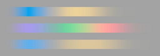 | Keywords: Protanope and deuteranope spectra.svg en Visible spectrum against a D65 grey background as seen by people with normal color vision middle protanopia top and deuteranopia bottom The horizontal wavelength scale is 1nm per nominal pixel Uses the CIE 2006 physiologically-relevant 2-degree LMS basis functions from http //www cvrl org/ciepr8dp htm the LMS-to-XYZ conversion from http //www cvrl org/database/text/cienewxyz/cie2012xyz2 htm and the XYZ-to-sRGB formulas from the sRGB standard The yellow and blue hues are the planes containing AB8A00 and 0088C5 and are meant to approximate the hues that unilateral dichromats report seeing The background is the darkest grey that brings everything into the sRGB gamut which is unfortunately very bright The result is not very pretty but I think it's more accurate than anything else currently on Commons 2016-10-05 own BenRG other versions cc-zero Color blindness Visible spectrum illustrations |