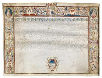 | Keywords: Prunkurkunde Camillo Caracciolo 1611.jpg Prunkurkunde ausgestellt von Camillo Caracciolo Fürst von Avellino Herzog von Atripalda Großkanzler des Königreichs Neapel 1611 Aufnahmeurkunde in das Doktorenkollegium der Universität Neapel für Amycus Angelus Mansus Magister und Doktor der Rechte; Neapel 6 6 1611 Pergamenturkunde 60 5 x 81 5 cm http //www dorotheum com Dorotheum 1611 anonymous PD-art-100 Images from Dorotheum 1611 in art 1611 documents Deeds University of Naples Federico II | ||||