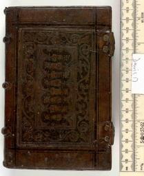 | Keywords: Psalterium Davidicum paraphrasibus - Upper cover (Davis17).jpg Style Panel design; Caption Upper cover; Colour Brown; Edge Unspecified exhibition history Decorative Technique Tooled in blind Panel stamp in blind; Cover Material Calf Wooden boards Traces of 2 pairs of clasps object history Text 1536; Cologne; Unspecified object type Cc-zero place of creation Binding England place of discovery See M M Foot The Henry Davis Gift vol II London 1983 British Library image http //www bl uk/catalogues/bookbindings/LargeImage aspx RecordId 020-000003152 ImageId ImageId 41181 Copyright BL Psalterium Davidicum paraphrasibus Uploaded with GWToolset Psalterium Davidicum paraphrasibus - Upper cover Davis17 http //www webarchive org uk/bldatasets/bindings/5679_4 jpg Bookbinding 16th-century bookbinding British Library Bookbindings |