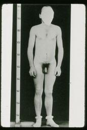 | Keywords: Pseudohypoparathyroidism.gif en The patient was a 45-year-old male who had been in the hospital multiple times with a diagnosis of pseudohypoparathyroidism He was originally seen with a diagnosis of epilepsy characterized by seizures which began at the age of 12 with jerking movements loss of consciousness tongue biting and incontinence Serum calcium was 6 5 and phosphate 4 5 with an alkaline phosphatase of 4 2 Parathyroid extract had no effect on his calcium or phosphorus and calcium chloride induced a change to normal Biopsy of the parathyroid showed only hyperplastic tissue For the past nine years he had been off all medication He had noticed blurring of vision and had cataracts in the right 1 and left 2 eyes of an anterior radiating pattern The basal ganglia were calcified The characteristics of pseudohypoparathyroidism are achondroplasia 3 mental deficiency and normal parathyroid biopsy http //cogancollection nei nih gov/dctcCoganImageEnlarge jsp photoNum 62977 photoTitle Case+594+photo+3 2C+clinical+photo+3 National Eye Institute public domain PD-USGov Pseudohypoparathyroidism Old photos of intellectual disability People with dwarfism |