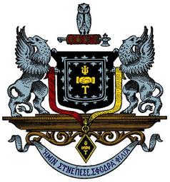 | Keywords: Psi Upsilon Crest.jpg en The Arms of the Fraternity are described in heraldic terms as a black shield bearing hands and letters of gold as in our badge around which emblems run what is known as a double tressure flory counter flory of silver The 'double tressure' alludes to the 'tie that binds ' the secrets ideals and aims of the Fraternity The black 'shield' was chosen not only because it is more effective than any other hue in line engraving which was the chief use of the coat-of-arms but also because it is the background of the badge The 'crest' consists of an owl surmounting Roman fasces The owl was assigned by the Greeks to Pallas Athena as an emblem of her supernatural wisdom and by the Romans to Minerva Goddess of Wisdom The 'fasces ' which the owl surmounts was a term given to a bundle of elm sticks or branches bound together with leather thongs or lashes and containing an axe with its blade projecting from the side These were carried by 'lectors' public officials attending Roman magistrates and were symbols of power The colors of the Fraternity are represented by a garnet ribbon on the dexter side of the shield and by a gold one at the left from which united below the shield depends by a ring the Psi Upsilon badge The supporters are two silver griffins typifying watchfulness and strength The motto selected from Plato translates to Unto us has befallen a mighty friendship For a Greek-letter fraternity a Greek motto is necessary 1894-01-10 http //www psiu us/about/heraldry html Albert P Jacobs Karl P Harrington George B Penny other versions PD-old-70-1923 Psi Upsilon |