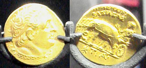 | Keywords: PtolemyWithElephants.jpg A rare coin of Ptolemy I showing himself riding a chariot drawn by elephants a reminder of his successful campaigns with Alexander in India Displayed at the Grand Palais Personal photograph 2006 2006-12-10 own assumed World Imaging Ptolemy I Egypt's sunken treasures exhibition at the Grand Palais Elephants on coins Coins of ptolemaic Egypt Chariots in ancient Greek art Elephant as a symbol of African Egypt | ||||