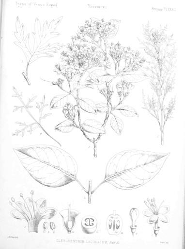 Keywords: PTRS168 0669.png Clerodendron laciniatum <small>Balf fil </small> Clerodendrum laciniatum <small>Balf f </small> twig of adult tree with flowers leaves of adult tree leaf of young tree leaf of very young tree twig of very young tree flower bud fully opened flower corolla and androecium from inside anthers gynoecium in calyx transverse section of unripe fruit vertical section of unripe fruit Philosophical Transactions of the Royal Society 168 An Account of the Petrological Botanical and Zoological Collections Made in Kerguelen's Land and Rodriguez During the Transit of Venus Expedition Carried Out by Order of Her Majesty's Government in the Years 1871-1875 Plate XXXII 1879 Scan by the Internet Archive Author died more than 70 years ago - public domain PD-old Philosophical Transactions - Volume 168 Clerodendrum laciniatum Verbenaceae botanical illustrations Unripe fruits |