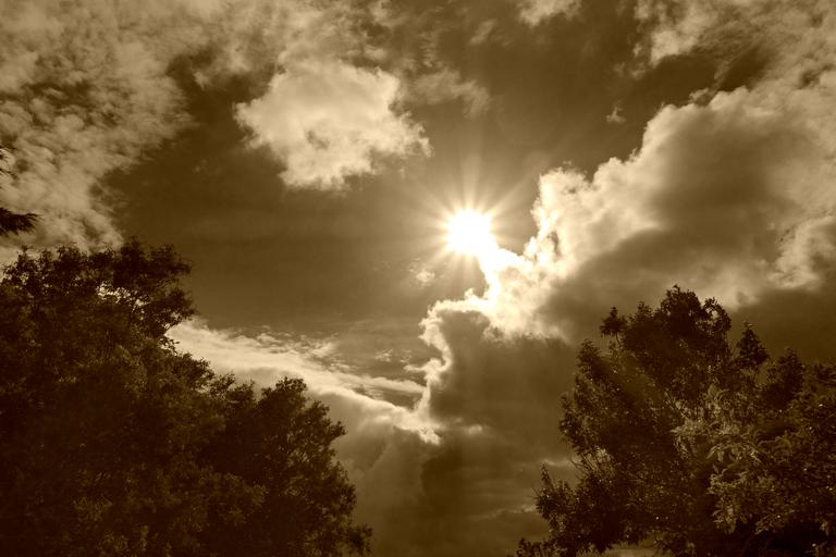 Keywords: clouds cumulus sky sun sunrays heaven biblical clouds sky cloudssky sky clouds skyclouds air atmosphere cloudscape treetops sepia monochrome public domain dedication publicdomaindedication mabelamber pixabay pexels