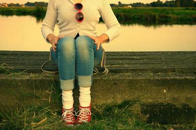 Keywords: cardigan evening fashion model jeans outfit red sneakers sitting socks sunglasses water's waters edge woman public domain dedication publicdomaindedication mabel amber mabelamber pexels