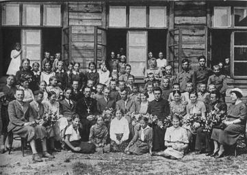 | Keywords: Publiczna Szkoła Powszechna stopnia III w Wiszniewie.jpg pl Uroczyste zakończenie roku szkolnego 1938/1939 w Publicznej Szkole Powszechnej w Wiszniewie w powiecie wołożyńskim województwa nowogródzkiego Od lewej siedzą Adam Chomicz Jan Jundził Maria Płażewska Kazimierz Duś pop NN Stanisław Łukaszewicz - kierownik szkoły inspektor szkolny z powiatu wołożyńskiego NN Maria Duś ks Jan Licynowicz Hołub kierowniczka biblioteki szkolnej Lidia Skurat Czesław Pachelski Józefa Pietraszkiewicz Od lewej w ostatnim rzędzie stoją Kławdia Szakonówna NN - córka zakrystiana posługującego w czasie nabożeństwa w cerkwi Helena Dubicka Julia Bittel z d Broszczyk Rywa Kielamanówna Żydówka; nieco z tyłu Ewa Miejszutowicz Żydówka Nachama Podberska Żydówka Rząd II niżej Anna-Irena Buraczewska Helena Giembicka pochodzenia tatarskiego Złata Kapłanówna Żydówka Tacjana Sienkiewiczówna Edward Matus Siedzą od lewej Regina Jankowska Helena Malinowska Helena Skadorwa Stanisława Hryniukówna W oknie drugim stoją od prawej Wala Oszykowska w białej bluzce Stanisława - jej koleżanka była woźną w szkole WItold Bernat stoi niżej Zusman Żyd drugi od prawej strony Z archiwum rodzinnego Julii Broszczyk z Piły 1939 Agnieszka Grędzik-Radziak Oświata i szkolnictwo polskie na ziemiach północno-wschodnich II Rzeczypospolitej i współczesnej Białorusi 1939 2001 Toruń Europejskie Centrum Edukacyjne 2007 s 153 ISBN 978-83-60738-09-2 author Custom license marker 2013 02 26 anonymous-EU Uploaded with UploadWizard History of Višnieva |