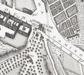 | Keywords: Puerta de Atocha-Plano de Nicolás Chalmandrier-1761.jpg es Plan geométrico e histórico de la Villa de Madrid y sus contornos Nicolas Chalmandrier 1761 Detalle de la Puerta de Atocha y las cuatro fuentes de las Delicias fr Plan geometrique et historique de la Ville de Madrid et de ses Environs; Gravé par N Chalmandrier 1761 1761 Biblioteca Nacional de España http //datos bne es/edicion/bica0000001064 html Nicolas Chalmandrier dominio publico PD-old-100 PD-old-100 cc-zero Croppings of Nicolas Chalmandrier's Topographia de la Villa de Madrid 1761 Puerta de Atocha gate Delicias Fountains Madrid in the 1760s |