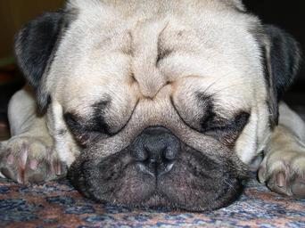 Keywords: pug dog pet purebred dog lap dog cute head face lying ground rest fur