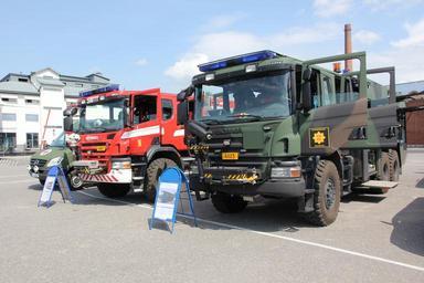| Keywords: Pujo puhdistusajoneuvo ja SM11 sammutusajoneuvo 1.JPG  en Pujo puhdistusajoneuvo chemical warfare decontamination vehicle and SM11 fire engine used by Finnish military Pujo is based on Scania Saurus 6x6 fire engine with 279 kW engine and weight of 23930 kg Equipped with Esteri D-240 pump and Rosenbauer R15E water cannon with tank capacity of 4800 liters hydraulic winch Warn 12 capacity 5 4 metric tons and ordinary fire engine equipment Additional equipment include high pressure pumps and cleaners emulsion tank and a decontamination tent with shower Primary function as a decontamination vehicle but can be used as an ordinary fire engine in peace time SM11 is a Scania P380 CB 4x4 Saurus 28 fire engine 279 kW engine weight 17280 kg Esteri D-240 pump Rosenbauer R8E water cannon 1000 l/min/10 bar with 2800 liter tank capacity 15 KVA emergency generator water rescue equipment and Warn 12 hydraulic winch with 5 4 metric ton capacity fi Suomen puolustusvoimien käyttämä Pujo kemiallisen sodankäynnin puhdistusajoneuvo ja SM11 paloauto Pujo on rakennettu Scania Saurus 6x6 paloauton alustalle 279 kW moottorilla ajoneuvon painon ollessa 23930 kg Varustuksena Esteri D-240 pumppu ja Rosenbauer R15E vesitykki joille yhteensä 4800 litran vesisäiliöt Warn 12 5 4 t hydraulivinssi ja normaali sammutusauton pelastuskalusto Puhdistukseen korkeapainepumppu ja -pesurit sekä emulsiosäiliö ja puhdistusteltta lämminvesisuihkulla Päätehtävänä ihmisten ja ajoneuvojen puhdistaminen kemiallisista aineista toimii myös sammutus- ja pelastusajoneuvona SM11 on keskiraskas sammutusauto Scania P380 CB 4x4 Saurus 28 279 kW moottori ajoneuvon paino 17280 kg Varustuksena Esteri D-240 pumppu Rosenbauer R8E vesitykki 1000 l/min/10 bar ja 2800 litran vesisäiliö 15 KVA n varavoimageneraattori pintapelastuskalusto Warn 12 5 4 tonnin hydraulivinssi sekä normaali sammutusauton pelastuskalusto own MKFI 2011-07-09 Finnish Navy anniversary 2011 PUJO decontamination vehicle Military fire engines of Finland Scania fire engines Scania P380 Taken with Canon EOS 60D Taken with Canon EF-S 15-85mm F3 5-5 6 IS USM Files by User MKFI |